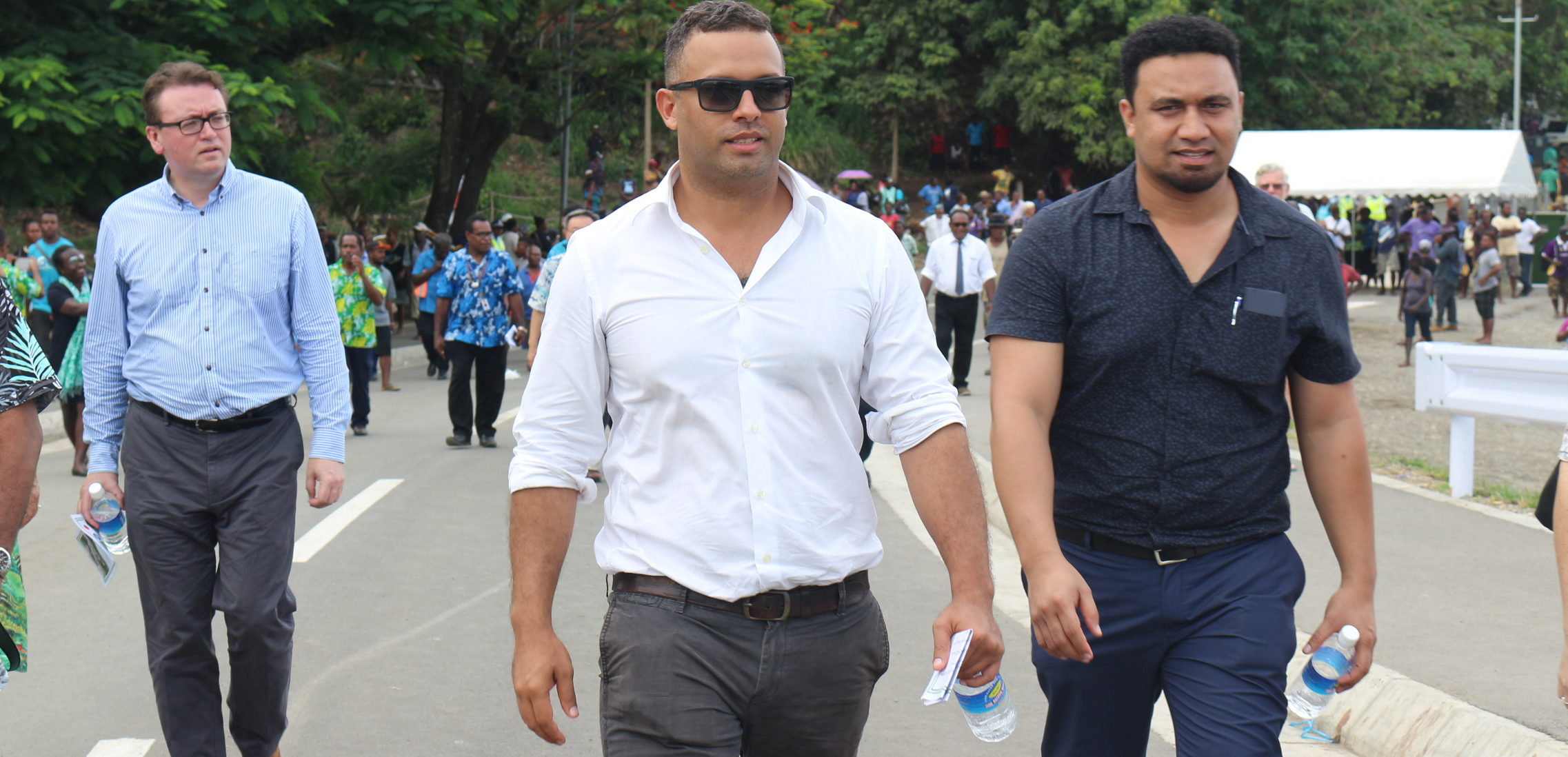 SICCI Chairman Jay Bartlett and Outgoing CEO Dennis Meone joins other invited guests at the official handover of the Kukum Highway Project for a walk over the newly built Mataniko Bridge.